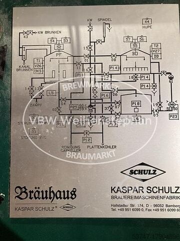 Полная минипивоварня - варочный цех 10 гл разлива и до 1500 гл годового производства. Высококачественный варочный котел Schulz, с двойными стенками, внутренним бойлером, фильтрационным чаном и вихревой ванной, полная обвязка, шланги. Полностью автоматическая установка со шкафом управления, ручным затиранием, добавлением хмеля и удалением дробины, солодовой мельницей, мелким оборудованием, охладителем сусла и аэрацией сусла. Погреб для брожения и хранения: 1 открытый бродильный чан объемом 10 гл, 2 плоскоконических бродильных чана общим объемом 20 и 30 гл, 4 резервуара для хранения объемом 20 гл, 6 дозирующих/напорных танков объемом 10 гл, 1 напорный танк объемом 30 гл, автоматический контроль температуры в бродильных танках, 2 погребных насоса, шланги, 1 ванна для дези. Зона розлива: 1 моечная машина с баком для горячей воды для мойки КЕГ и бутылок; 1 сифонный наполнитель Множество аксессуаров, мелких деталей, шлангов и т. д. Коммунальные услуги: 1 парогенератор 120 кг/ч 1 система охлаждения для хранения льда 1 система сжатого воздуха