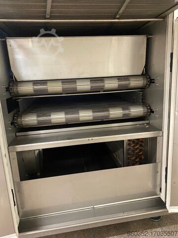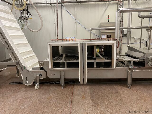 2) Пастеризатор модели SPA610VD, электрическая мощность 1,2 кВт, тепловая мощность 120400 кал/ч (140 кВт), ширина ленты мм. 1000, длина пастеризационного бака мм. 6000, габаритные размеры мм. 10163 x 1600 x 2210 (h), общий вес кг. 1000