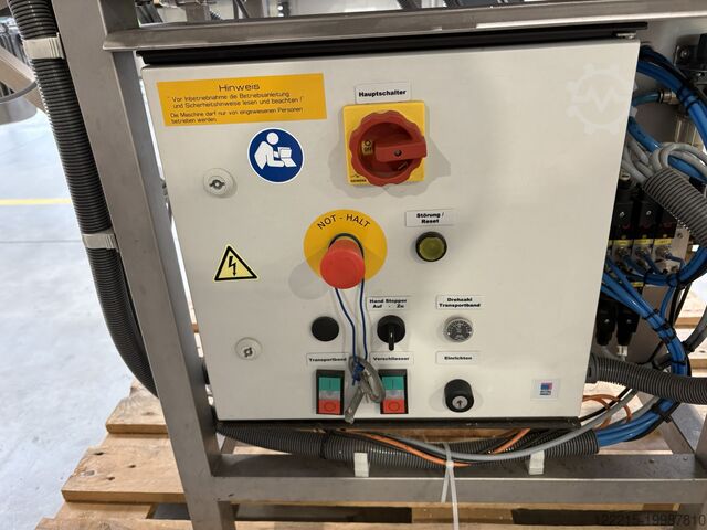 Обзор: Эта компактная укупорочная машина была изготовлена в 2016 году немецкой фирмой ALWID. Основные компоненты выполнены из нержавеющей стали. Машина предназначена как inline-система для обработки стеклянных бутылок с Т-образной пробкой. Оборудована укупорочной головкой для Т-образных пробок диаметром 34/19 мм и высотой 22/13 мм. Благодаря нашим отношениям с компанией ALWID мы можем оперативно предложить комплекты для переналадки на разные бутылки и пробки. Технические данные: Мобильная рама из нержавеющей стали Головка для Т-образных пробок Ø34/19 мм, высота 22/13 мм Подающий лоток для Ø34/19 мм и высоты 22/13 мм Сортировочная единица с вибрационной винтовой подачей и шумопоглощающим кожухом Транспортёр Стопор Защитный кожух с блокировочным выключателем Электроуправление через SIEMENS Logo
