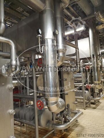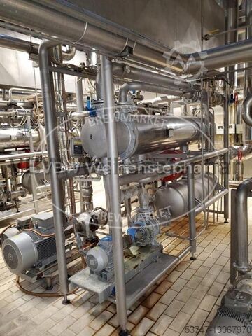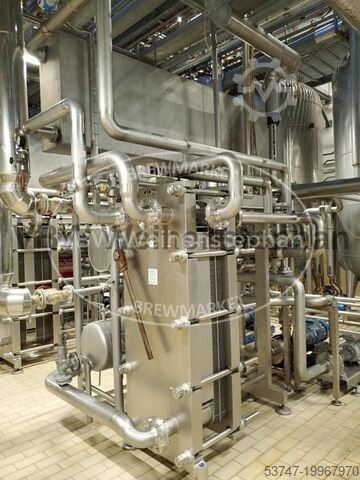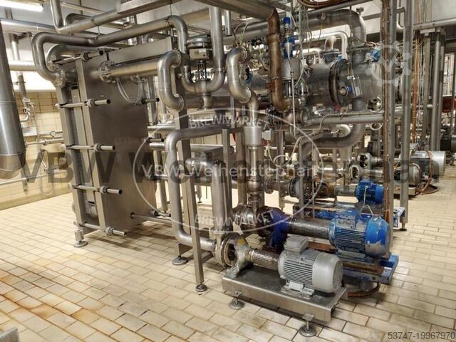 Оснащение: 2x пластинчатых теплообменника, 1x трубчатый теплообменник, 1x насос для горячей воды, 2x насоса для пива.