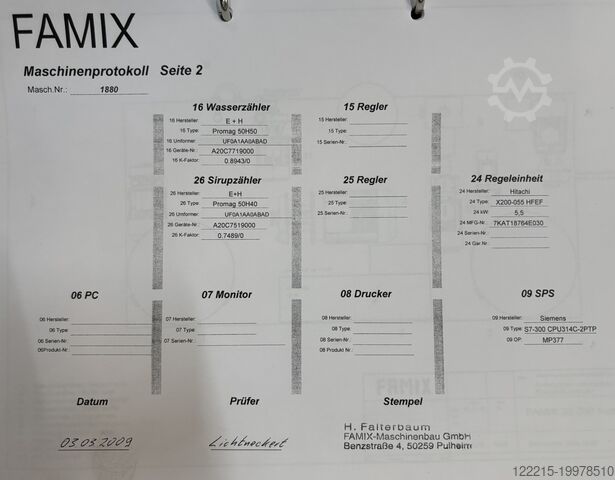Обзор Данный 2-компонентный миксер был изготовлен в 2008 году немецким производителем Famix. Машина доступна в текущем состоянии немедленно. Технические данные Производительность: макс. 30.000 л/ч 2-компонентный миксер Габариты (ДxШxВ): 3200 мм x 1700 мм x 2700 мм Расходомер Дозировочный насос Вакуумная дегазация Измерение Brix Измерение CO2 Регулятор давления CO2 Измерение электропроводности Электрические данные Рабочее напряжение 400В/230В 50 Гц, 80А SIEMENS S7-300