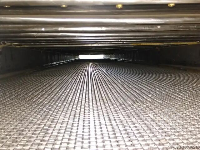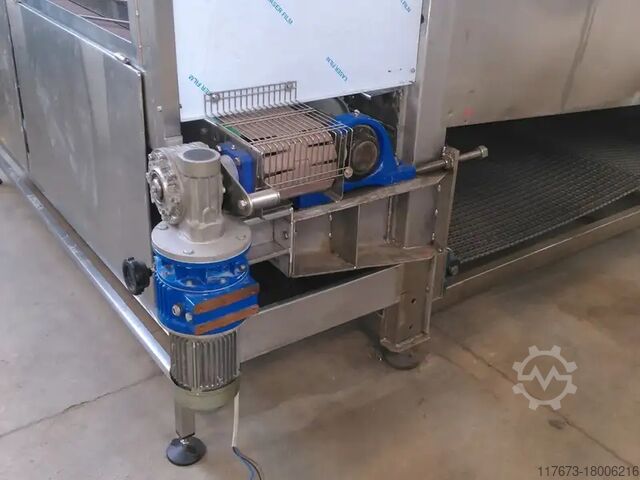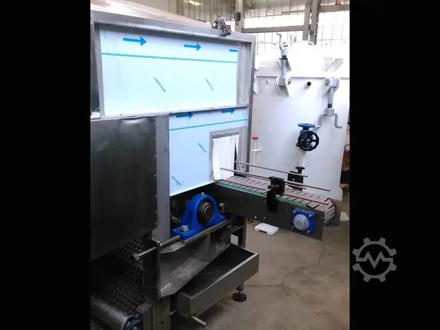 Сетчатый пастеризатор марки Tecnoindustria из нержавеющей стали с квадратной сеткой из нержавеющей стали в комплекте с баками для рециркуляции воды с соответствующими насосами, подающей и отводящей лентой для банок или коробок, вентилятором для сушки банок или коробок, группой модуляции пара, теплообменником, различными соединительными трубами и всеми аксессуарами для работы.
