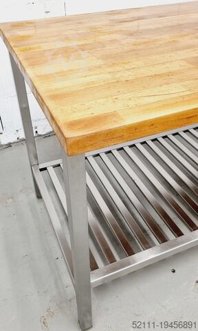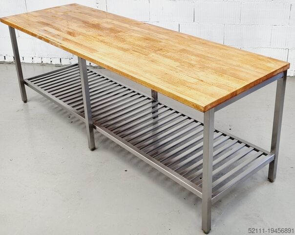 Рабочий / пекарский стол с рабочей поверхностью из бука, с нижней полкой-решеткой. Исполнение из нержавеющей стали. Размеры примерно: 2500 x 800 x 890 мм (ШxГxВ). Б/у оборудование, очищено. Столешница отшлифована и заново обработана маслом.