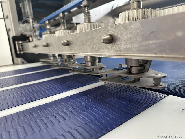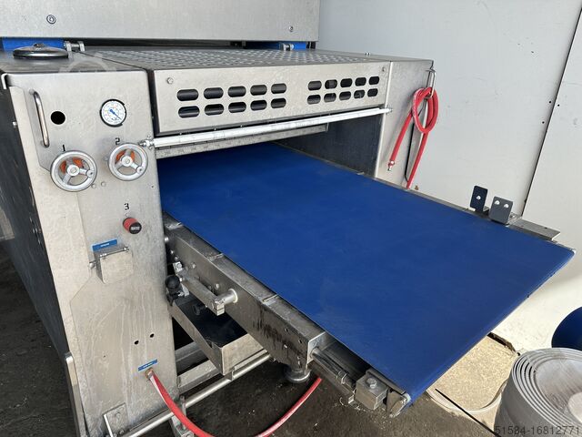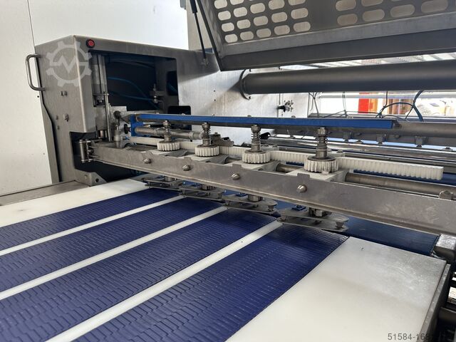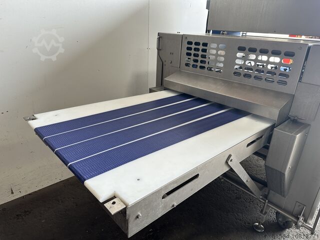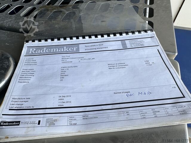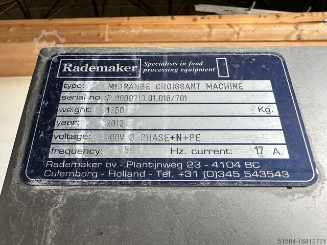 2012 год, нержавеющая, машина для производства круассанов среднего класса, рабочая ширина 850 мм, поставляется в линию с формовщиком Rademaker V, сенсорное управление HMI, ранее использовалась для производства прямых круассанов в 3 и 4 ряда на производственных линиях 600 мм и 800 мм, поставляется с запасными ремнями, двигателями и множеством запасных частей, мобильный 3Ph,