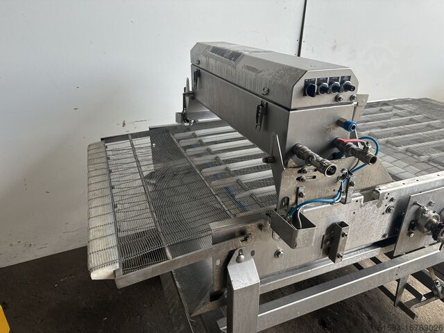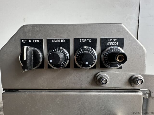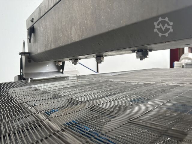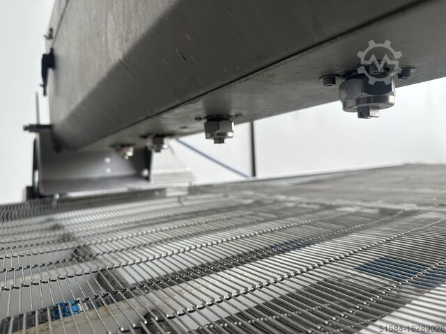 2017, нержавеющая, распылительная глазировочная установка, размеры ленты 2150 мм x 820 мм, лента из нержавеющей сетки, четыре верхние форсунки, регулируемые регуляторы давления, может работать с большим количеством жидкостей от чистой воды до масла и глазури, мобильная, 3Ph