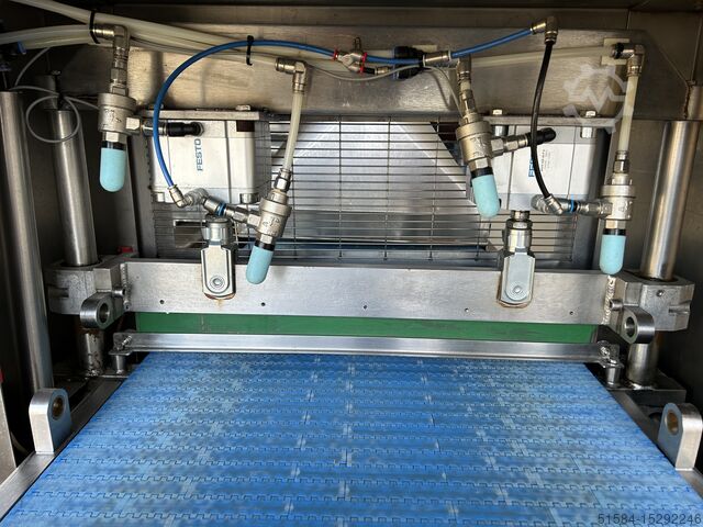 Нержавеющая гильотина, установленная на конвейере, ранее использовалась для резки тортов и сотов, размеры конвейера 2200 мм x 640 мм, регулируемая выдержка и время резки, регулируемая скорость, 3Ph
