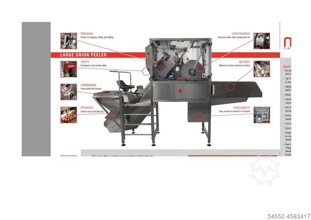 Большая лукоочистительная машина компании M&P engineering очищает лук диаметром от 45 мм до 115 мм с помощью саморегулирующихся плавающих ножей в диапазоне до 25 мм при любой настройке. Затем машина разрезает лук по горизонтали от макушки до хвостика, глубина разреза определяется качеством и сортом лука. В завершение машина удаляет кожицу с помощью сжатого воздуха, обеспечивая конечный продукт оптимального внешнего вида.
