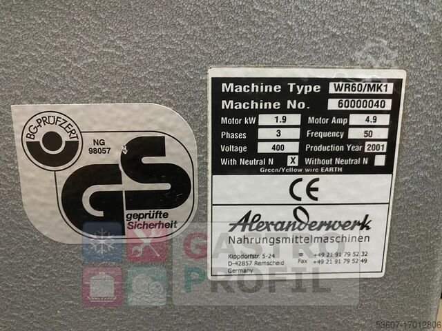 Это планетарный миксер WR60 / MK 1 от известного производителя Alexanderwerk. Этот миксер идеально подходит для замешивания, смешивания, перемешивания и взбивания. Представленные аксессуары, включая чашу для смешивания объемом 60 литров, венчик, мешалку и крюк для теста, включены в стоимость. Прибор прошел полную проверку в нашей мастерской и полностью исправен.