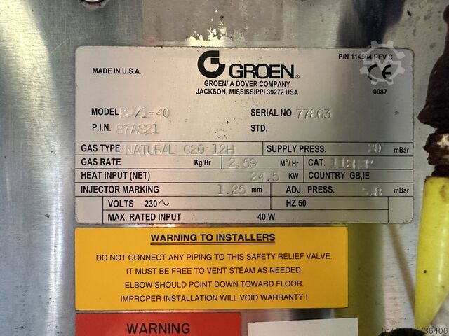 Нержавеющий опрокидывающийся чайник, с рубашкой, природный газ, тепловая мощность 24,5 кВт, с крышкой, 1Ph