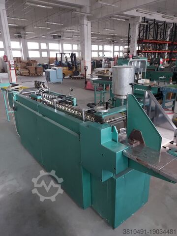 Оригинальная японская линия по производству картонных книг. В состав автономного комплекта входит станок для склеивания картонных книг - 8 станций. нанесение клея валиками. Отдельный пресс, машина для обертывания обложек. Можно купить набор из трех ножей Wholenberg с набором для скругления углов.