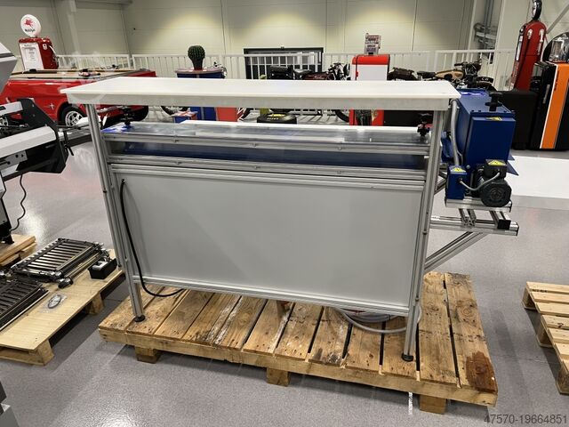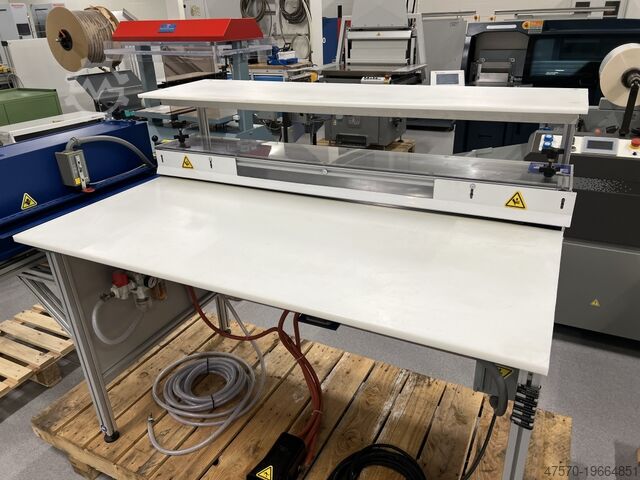 Позволяет изготавливать обложки большого формата, например, книги-образцы. Станок оснащен модулем для загиба кромок шпона Stomper, модулем для прессования готовой обложки, большим рабочим столом и приемным столом.