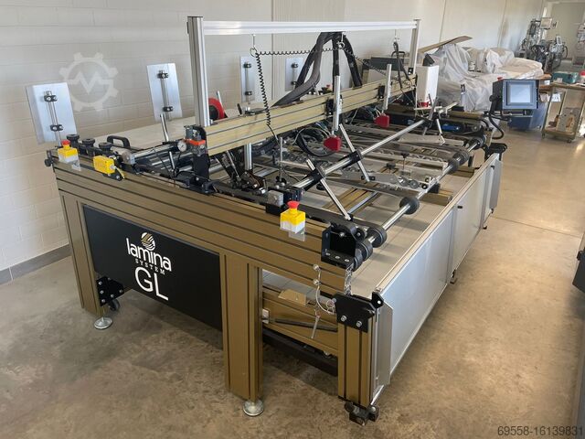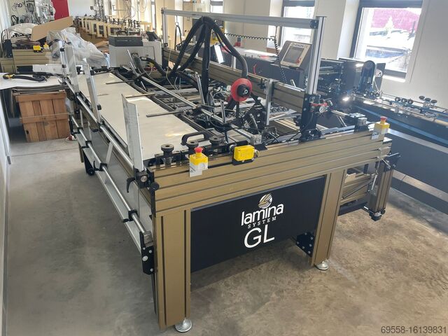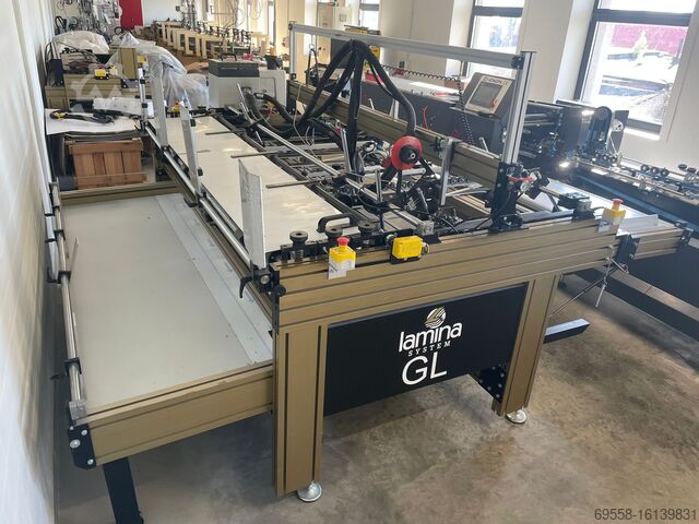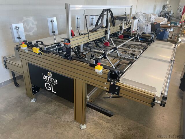 Absolutely new hot gluing station Lamina GL2200. Year of manufacture 2018. In protective film. Removable table. Instaled a hot gluing system Xmelt, from HHS, with two guns. Guarantee. For more detailed information please contact us by email.