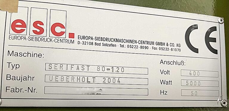 В наличии имеется трафаретная печатная машина ESC (Европейский центр трафаретных печатных машин), которая была полностью модернизирована в 2004 году. Формат печати: 1000 мм/1400 мм, макс. толщина материала для печати: 7 мм, макс. размеры рамки экрана X/Y: 1540 мм/1800 мм. Документация доступна. Возможен выездной осмотр.
