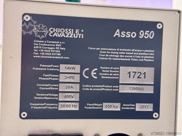 CHIOSSI ASSO 950 сушилка – компактная текстильная сушилка, которая благодаря технологии двойной ленты занимает очень мало места. Использовалась в цифровой текстильной печати вместе с Kornit Avalanche. Идеальное состояние и работоспособность. В любой момент можно провести осмотр с подачей питания.
