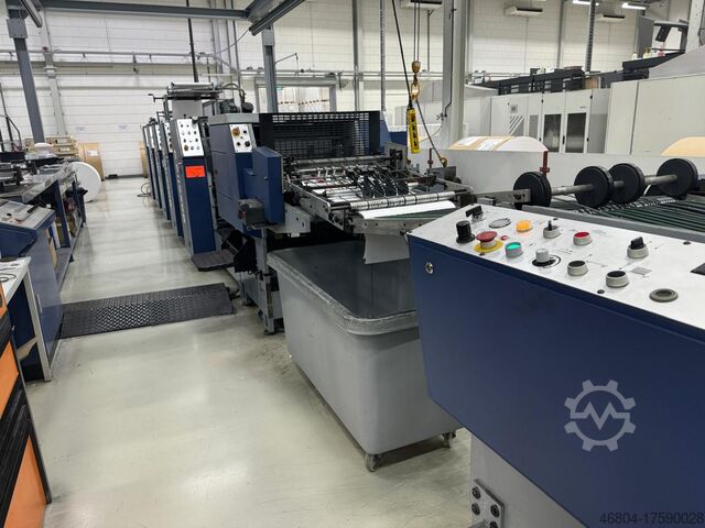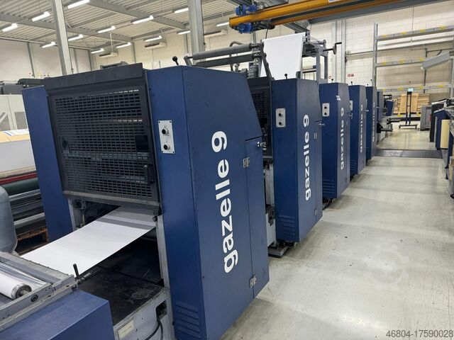GAZELLE 9 S Вариативная печатная машина, 5 башен мокрой офсетной печати, Ширина полотна 520 мм, Ширина печати 510 мм, Механическая скорость 350 м/мин, Главный двигатель. Состояние : восстановленный. Спецификация : 1 x станция размотки бумаги для рулонов максимальным диаметром 127 см (50"), 1 x вал размотки - диаметр сердечника 70 мм, 1 x контроль края полотна, 1 x блок контроля натяжения полотна (подача), 5 x печатная башня - мокрый офсет - три формных вала, переменный размер от 17" до 28", 5 x печатные вставки 25'' пластины 0,3 мм. и клеящееся полотно 1,65 мм, 5 x Печатные вставки 17'' пластины 0,3 мм. и клеящееся полотно 1,65 мм, 1 x Турник для печати с лицевой и оборотной стороны, 1 x Блок управления спиртом для системы увлажнения, 1 x Вальцовочная машина Drent Gazelle 9S, регулировка 360°. Допуск ± 0,25 мм, бумага 40 гр. 140 м/мин, 1 x Листогибочный цилиндр для 17'' и 25'', 1 x Drent Gazelle 9S безостановочная подача с высоким ворсом, регулируемая 6'' - 25'' , 1 x Система перфорации листов и пленок, 1 x Стол для гибки листов, устройство для присасывания краев, 1 x Комплект технической документации и инструкция, 1 x Ящик с инструментами, 1 x Кран для смены печатных вставок.
