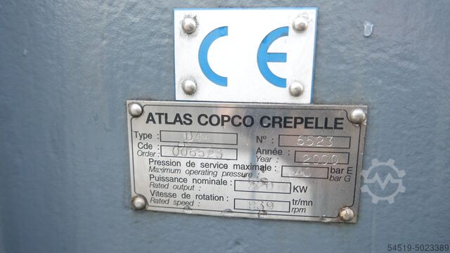 Компрессор высокого давления Atlas Copco Crepelle Тип: D44 Год выпуска: 2000 Рабочее давление: 40 бар Мощность: 220 кВт Скорость: 839 об/мин Компрессор можно осмотреть в любое время. Bwjc R Nc Iof Hly Ssfnop