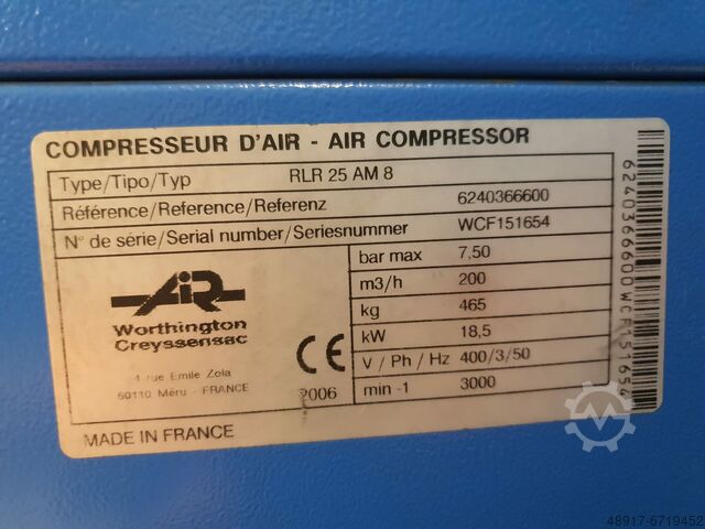 Винтовой компрессор Worthington Creyssensac RLR 25 AM8 с осушителем воздуха DW21 и ресивером F900 (900 литров). Год выпуска: 2006. Часы: 16405. Состояние: очень хорошее. После полного технического обслуживания (новые фильтры, масло, ремни).