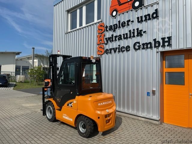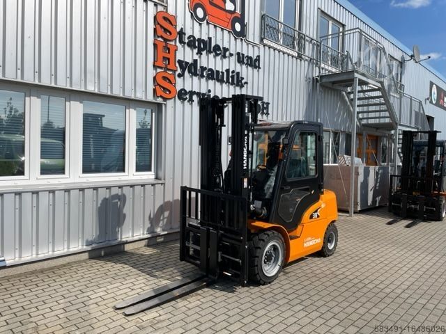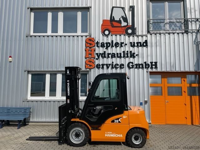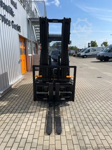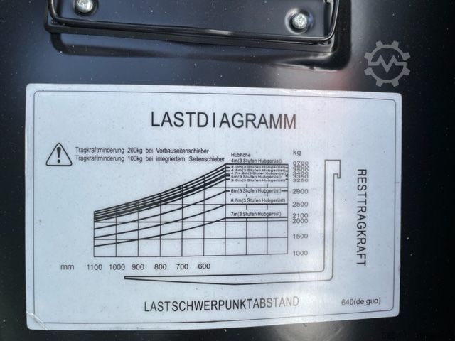 Описание: Полная кабина с отоплением, передние рабочие фары, задние BlueSpot, вращающийся маяк, 3-й + 4-й клапан на каретке вил, ручной рычаг