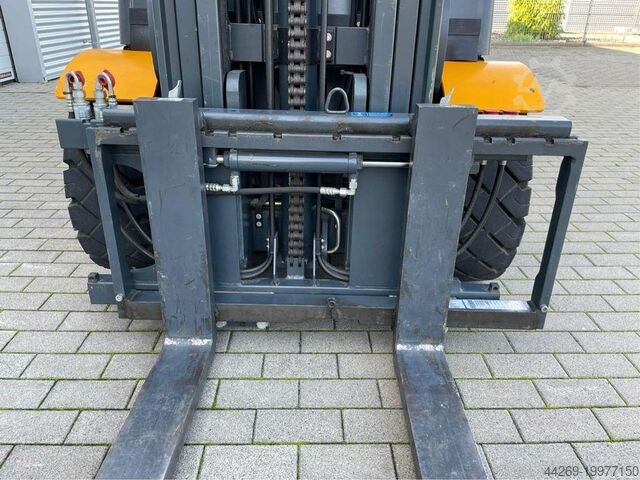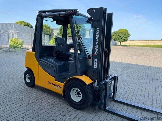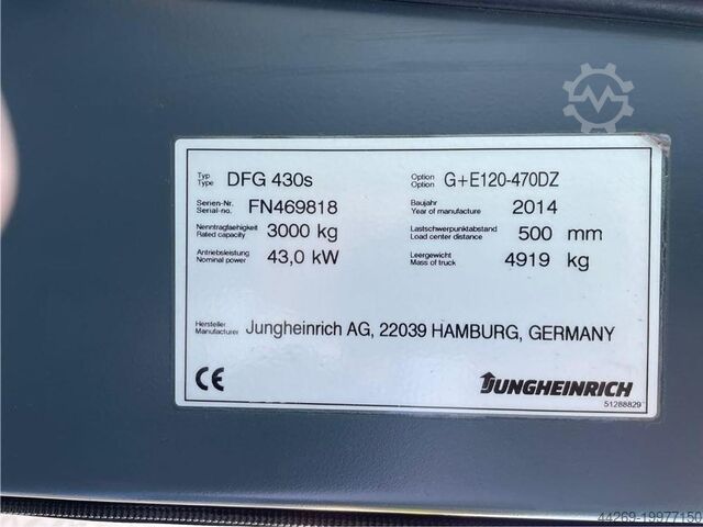 Вилочный погрузчик Jungheinrich с дополнительным оборудованием: счетчик моточасов, боковой сдвиг, сигнализация заднего хода, дополнительная гидравлика с 2 функциями, 2 рабочих фары спереди и сзади, лобовое, верхнее и заднее стекло, зеркала, проблесковый маячок. Грузоподъемность: 3 000 кг Высота подъема: 4 700 мм Монтажная высота: 2 198 мм Длина вил: 1 200 мм Центр тяжести груза: 500 мм Мачта: тройная с свободным ходом.