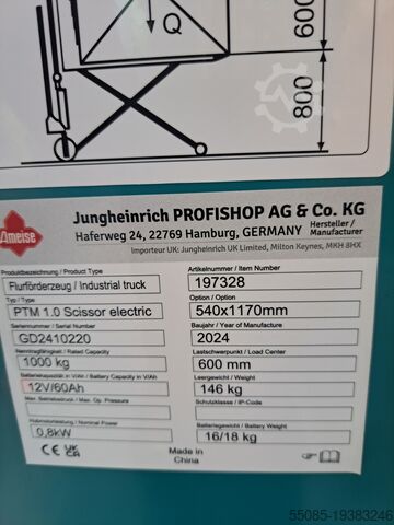 Привод: Ручной; Диапазон подъема: 85-100 мм; Передвижение до высоты: 400 мм; Центр тяжести груза: 600 мм; Материал рулевого колеса: нейлон; Оснащение роликов вил: Одинарные; Скорость опускания с грузом/без груза: 0,1 м/с / 40 c; RAL цвет шасси: RAL 5018 бирюзово-синий; Встроенное зарядное устройство для удобной зарядки