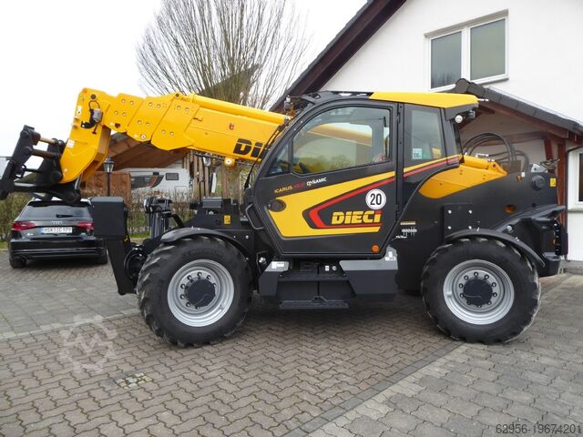 Телескопический погрузчик модель ICARUS 45.17 GD двигатель 2PL1107 ----- 1 ICARUS 45.17 DYNAMIC ST.V IT 1 ST ICARUS 45.17 DYNAMIC - GD TÜV/DEKRA одобрение 20 KM/H (только для Германии) - Автоматическая блокировка дифференциала 45% на второй оси Гидравлический однорычажный блок управления с пропорциональным и одновременным управлением (разделение потока). Открытая центральная система Комплект колес#400/70-24#Power CL Michelin с брызговиками Фиксированная пластина для переноски оборудования Dieci Амортизация поворота стрелы (Не совместима с предварительным оснащением корзиной) Стандартное отопление Сиденье с пневматической подвеской Индикаторная лампа Комплект для правильного рулевого управления Подготовка для радиоприемника Комплект для комфорта кабины (солнцезащита, задняя сетка для хранения, двойной порт USB) Стандартные зеркала заднего вида справа и слева Рычаг FNR под рулем - Камера заднего вида, встроенная в дисплей машины. Светодиодные фары на оголовке стрелы Два задних поворотных светодиодных рабочих фонаря на кабине Светодиодные рабочие фары (1 с правой стороны, 1 с левой стороны, 1 сзади) Дорожные фонари (передние) со светодиодными дневными ходовыми огнями. Зеркало заднего вида 7-контактная розетка для прицепа. Пара плавающих вил 120 x 50 мм, L = 1200. Грузоподъемность 5,0 т.