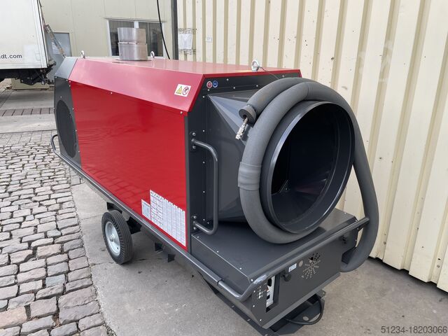 GB 200-RHP, передвижной генератор теплого воздуха (400 В) с отдельным каналом для выхлопных газов, установленной масляной горелкой RG 4, предварительным фильтром жидкого топлива, радиальным вентилятором и готовым к подключению термостатом.