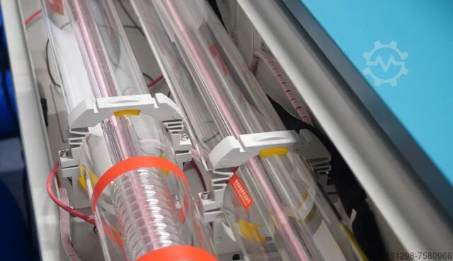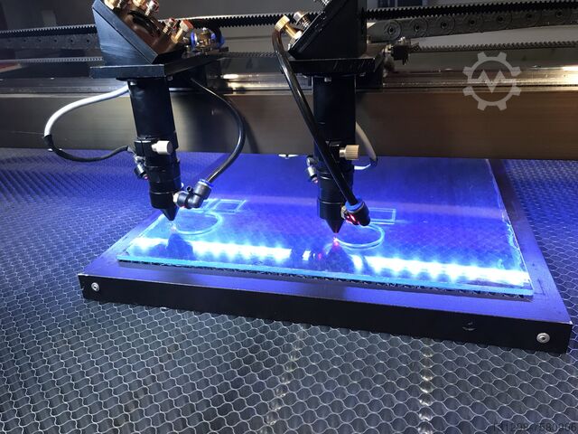 Две лазерные головки работают одновременно на расстоянии не менее 130 мм друг от друга. Каждая из них имеет свою лазерную трубку мощностью 100-120 Вт, что обеспечивает быструю работу. Конвейерный стол равномерно и без складок подает материал в станок.