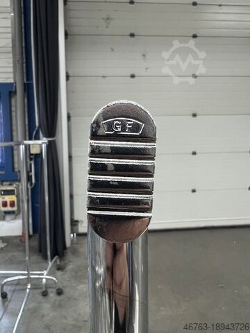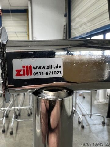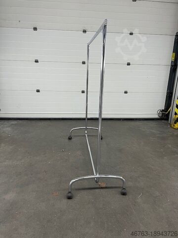 Вешалка для одежды из глянцевого хрома с пластиковыми колесами диаметром 80 мм, два из которых оснащены тормозами. Прокатный стенд изготовлен из круглой трубы диаметром 28 мм и собирается с помощью замкового соединения.