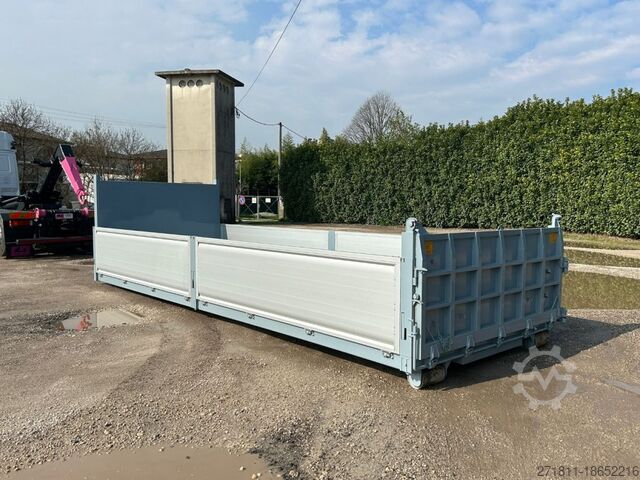 TITLE: NEW FLAT CONTAINER WITH REMOVABLE IRON PILLARS AND TWO SIDES PER SIDE IN TR5 AND REAR SIDE IN 3-EFFECT CHECKED IRON, BOOK-SHAPED, TIPPABLE UPWARDS AND TIPPABLE DOWNWARDS WITH 200 MM BEAMS RESTING ON THE FLOOR WITH 2.50 METRES OF REINFORCEMENT IN THE MIDDLE OF THE EXTERNAL PART WITH A CAPACITY OF 16,000 kg / 18,000 kg. 5 DISAPPEARING HOOKS ON THE LEFT SIDE AND 5 DISAPPEARING HOOKS ON THE RIGHT SIDE AND 2 FRONT ANCHORING HOOKS IN CORRESPONDENCE WITH THE BEAMS.