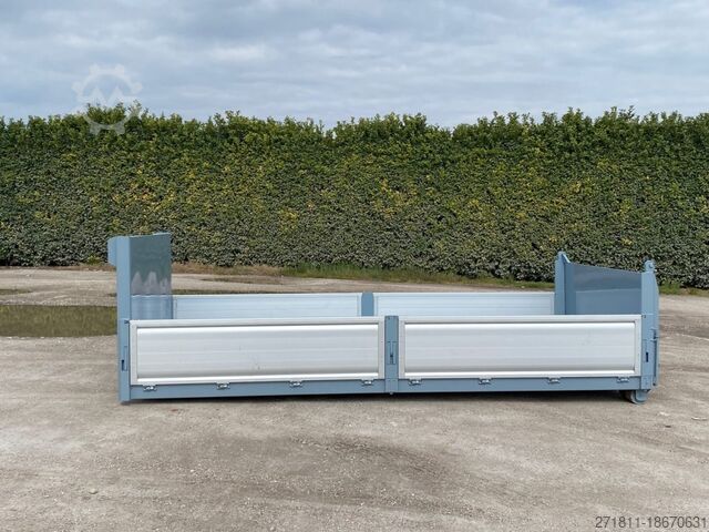 TITLE: NEW FLAT CONTAINER WITH REMOVABLE IRON PILLARS AND TWO TR5 SIDES PER SIDE AND 3-WAY BOOK-SHAPED IRON REAR SIDE, TIPPABLE UPWARDS AND TIPPABLE DOWNWARDS WITH 200 MM SUPPORT BEAMS