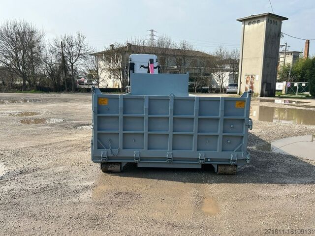 TITLE: NEW FLAT CONTAINER WITH REMOVABLE IRON PILLARS AND TWO SIDES PER SIDE IN TR5 AND REAR SIDE IN 3-EFFECT CHECKED IRON, BOOK-SHAPED, TIPPABLE UPWARDS AND TIPPABLE DOWNWARDS WITH 200 MM BEAMS RESTING ON THE FLOOR WITH 2.50 METRES OF REINFORCEMENT IN THE MIDDLE OF THE EXTERNAL PART WITH A CAPACITY OF 16,000 kg / 18,000 kg. 5 DISAPPEARING HOOKS ON THE LEFT SIDE AND 5 DISAPPEARING HOOKS ON THE RIGHT SIDE AND 2 FRONT ANCHORING HOOKS IN CORRESPONDENCE WITH THE BEAMS. REF: 24-N-06
