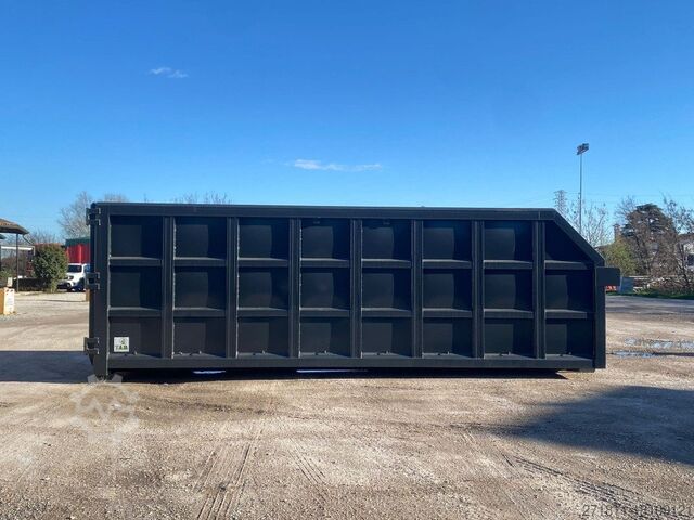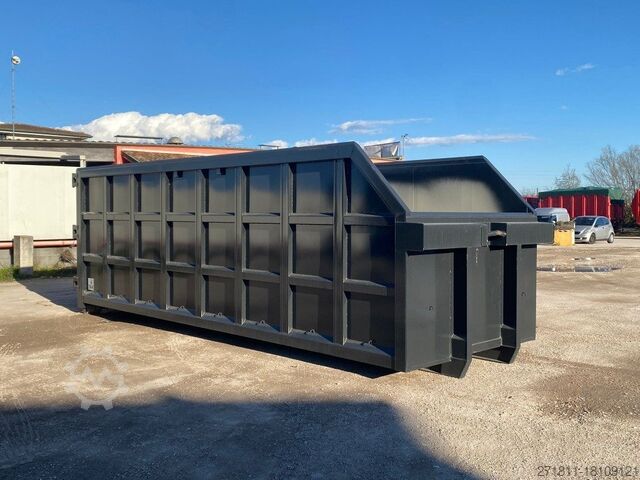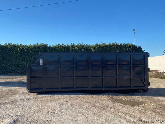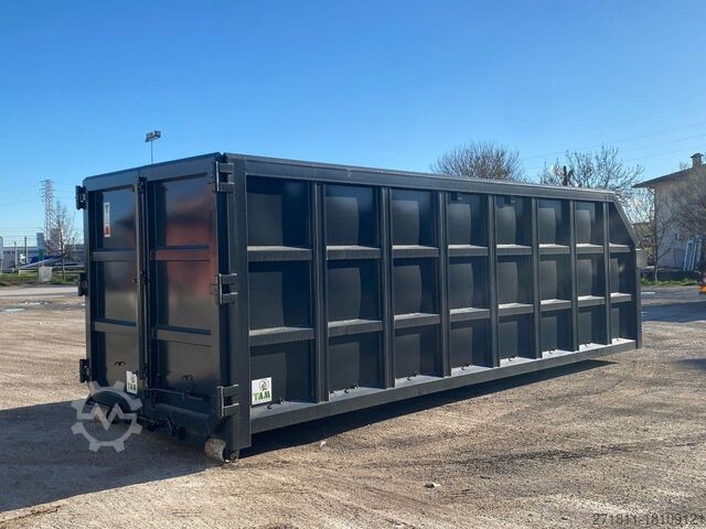 TITLE: NEW OPEN-TOP HOOK-AND-LOOP CONTAINER FOR BULKY WASTE IN REINFORCED HARDOX WITH CRANE COUNTER AND ROCK SPLIT UPPER EDGE, REAR OPENING WITH TWO FOLDING DOORS AND 3 HINGES PER DOOR, BOTTOM SUPPORTED BY 200 MM BEAMS