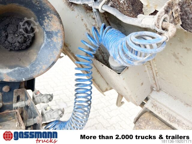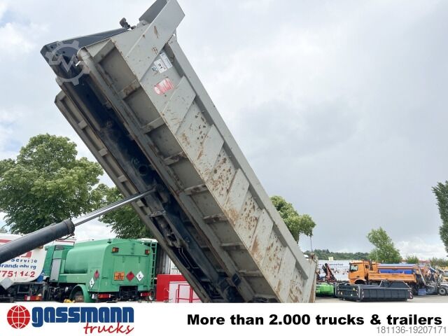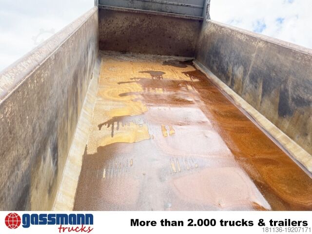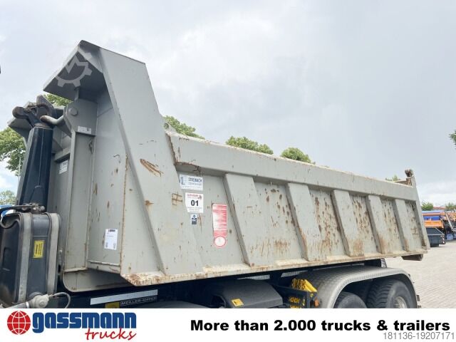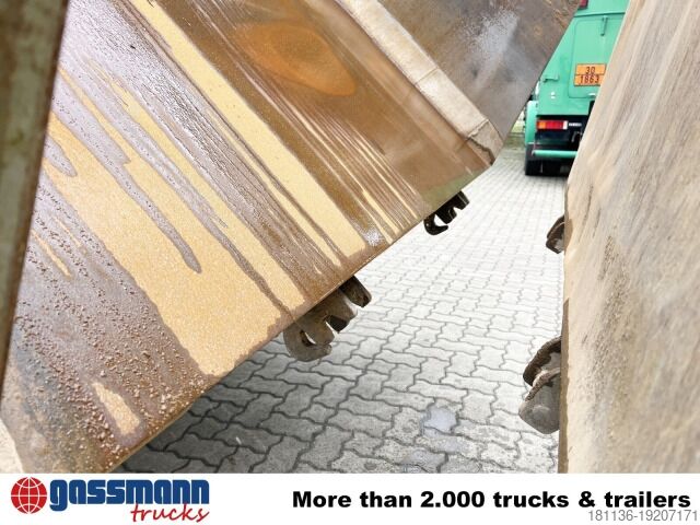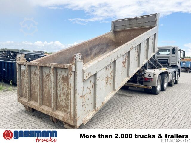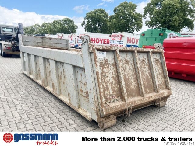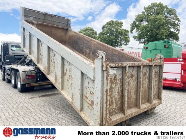 Body: Strobach roll-off container with tailgate, 15 cbm, 4 mm front and side walls made of fine-grain steel S700, 5 mm BHardox floor HB 450, raised front wall with cab protection slope, edge profile made of Kent profile with roof-shaped upper edge, jet profile made of U-profile 350 x 70 mm, floor assembly made of U-profile 120 x 60 x 6 mm, tailgate with raised self-aligning bearings, central locking with pneumatic opening via 2 spring-loaded cylinders, weld seams fully welded (RAL 7030). ACCESSORIES INFORMATION IS SUBJECT TO GUARANTEE. Subject to changes, prior sale, and errors!