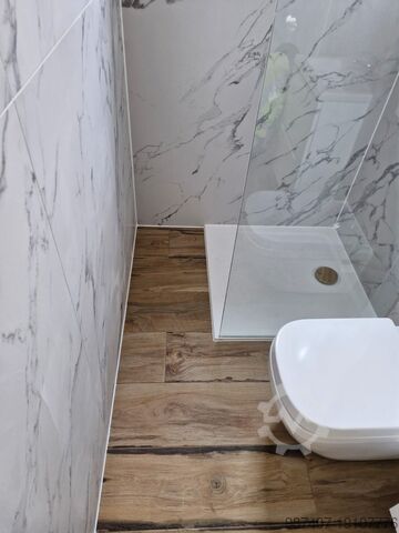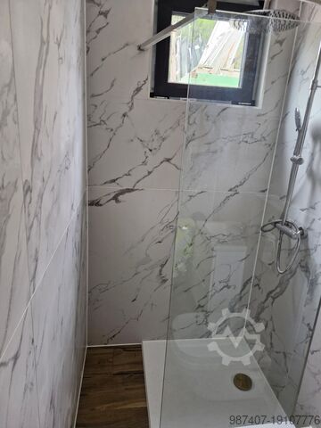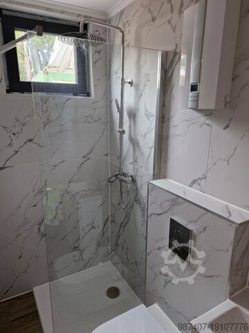 Фасад оформлен в модных антрацитовых тонах + вставки из листового металла, имитирующие дерево. Большое остекление. Раздвижные стеклянные двери. Электромонтаж со светодиодным освещением, выключателями и розетками. Пол покрыт панелями с высоким классом истираемости. Полностью оборудованная ванная комната. Душевая кабина с тропическим душем, встроенный унитаз, умывальник со шкафчиком, зеркало, электрический проточный водонагреватель. Контейнер изготовлен по немецким стандартам. Изоляция – минеральная вата.