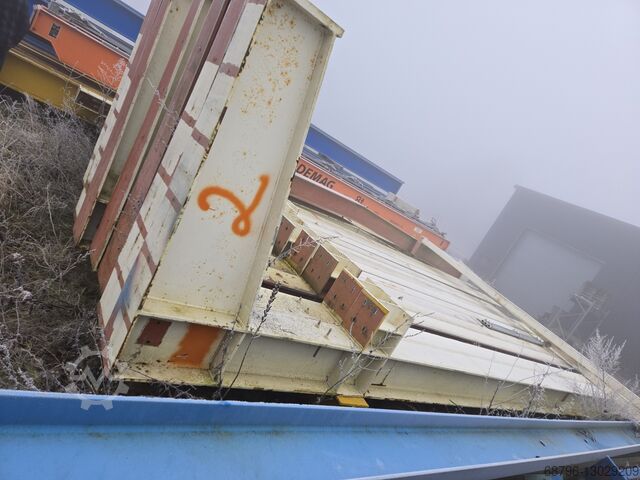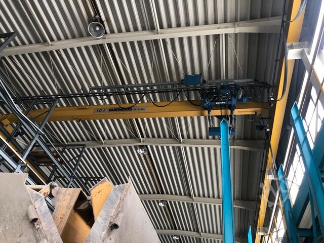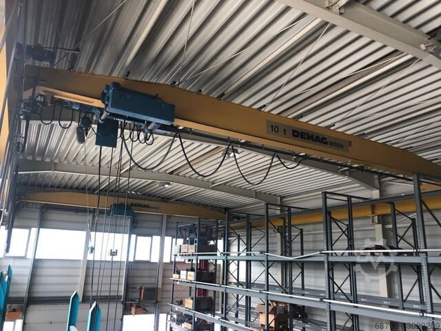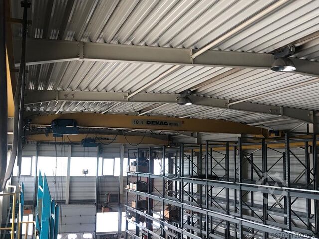 2 шт. однобалочных мостовых крана Demag 10т x 12000мм высота подъема от чистого пола около 7,5м, скорость подъема 4/0,8м/мин, скорость передвижения тележки 20/5м/мин, скорость передвижения крана 40/10м/мин. Краны передаются в идеальном состоянии после цехового осмотра, каждый с новым радиоуправлением HBC Micron 5, оптическое отключение друг против друга. Предварительное отключение в конце пути тележки и крана в каждом случае