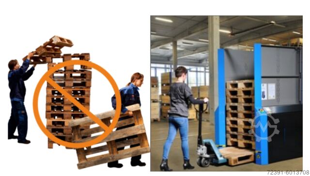 Пустые паллеты загружаются и выгружаются в штабель высотой до 15 паллет с помощью обычного или электрического транспортировщика паллет.