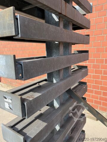 Консольный стеллаж, двусторонний, 10 уровней, вылет 380 мм, выдвижение на 220 мм, высота 2420 мм, общая глубина 1000 мм, длина примерно 2700 мм. Консольные балки из U-образной стали 80 мм. Очень прочная конструкция. Стеллаж оцинкован методом горячего цинкования. Вес 1190 кг. Для транспортировки стеллаж разобран.