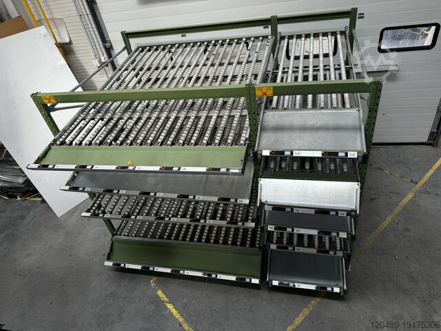 Поточные стеллажи разделены на слегка наклонные уровни потока и предназначены для выдачи товаров по принципу FIFO (первым пришел — первым ушел). Заполнение полок осуществляется с задней стороны, а товары перемещаются по пластиковым роликам на противоположную сторону, откуда их можно вынимать по мере необходимости.