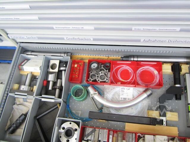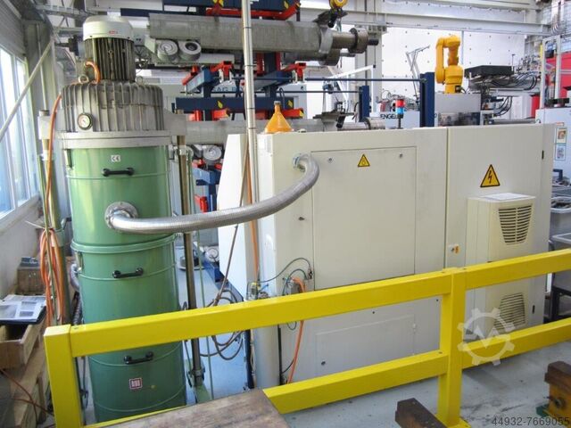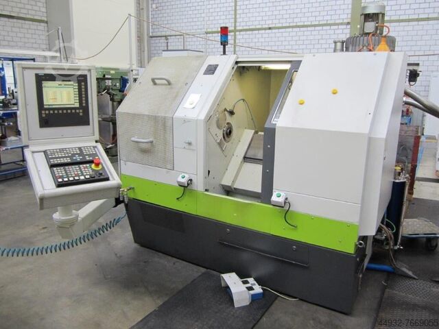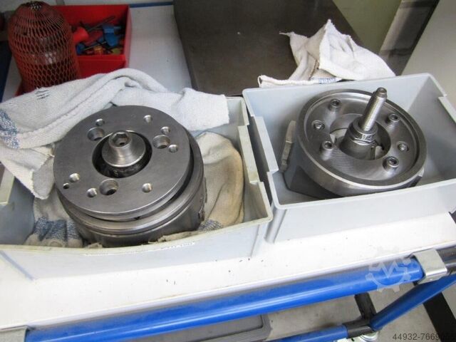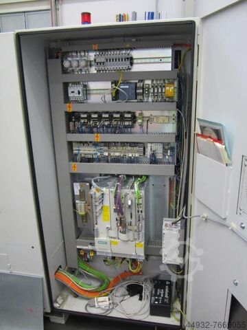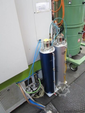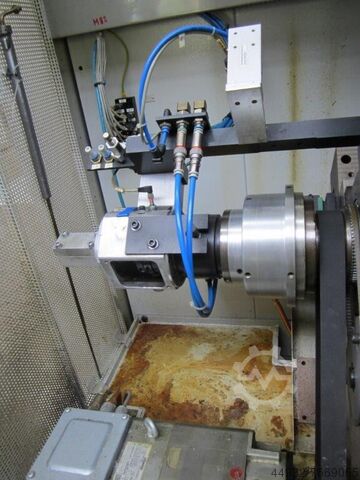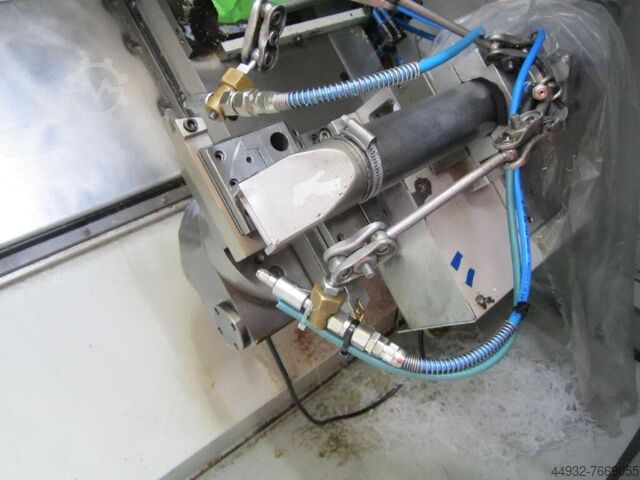 Диаметр точения над станиной Ø 400 мм, ход X/Y/Z 170/50/505 мм, Q-ось 360°, 2+1 инструмента, шпиндель 7 кВт, 0-4000 об/мин, диаметр прутка Ø 42 мм, управление SIEMENS 840D, стружкоотвод, минимальное количество смазки, пневм. Полый зажимной цилиндр, по 1 патрону 2+2 + 3 Ø 160 мм, вытяжные трубки, руководства и т.д.; использовался для обработки пластмасс