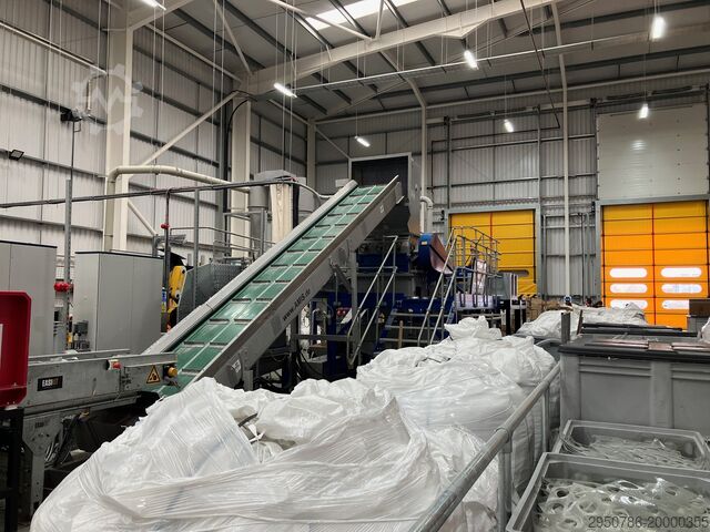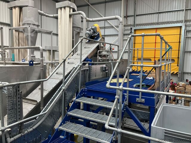 Очень редкая возможность приобрести трёхлетнюю линию для горячей мойки и очистки жёстких полимеров производительностью 600 кг/ч, предназначенную для измельчения и очистки различных видов жёстких пластиков. Оборудование использовалось крайне мало и предлагается к продаже исключительно в связи с реорганизацией деятельности компании. Подача материала осуществляется через транспортер с зоной ручной сортировки и металлоискателем, поступая с устройства опрокидывания клетей в крупногабаритный гранулятор для горячей мойки. Далее измельчённый материал поступает на вибросито для отделения основной части грязной воды, после чего направляется шнековым конвейером Архимеда на горизонтальный высокооборотистый центрифужный очиститель. После этой стадии материал поступает в вертикальный центрифужный сушильный аппарат большого диаметра, затем, после сушки, направляется в сепаратор с воздушным потоком ZigZag, откуда готовый продукт транспортируется в циклон над двухпозиционной башней для упаковки. Мелкие фракции, отделённые на этом этапе, по воздуху направляются в отдельный циклон над однопозиционной башней для упаковки пыли, волокон и других тонких примесей, удаляемых через башню ZigZag.