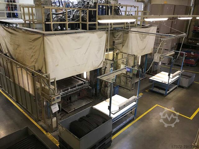 Имеются два одинаковых пресса, макс. скорость подъема: 200 мм/с, вязкость масла: 46cSt при 40°C, макс. гидравлическое/рабочее давление: 25/ 210бар, вес полуинструмента: 10т, производительность насоса при 75/ 210бар: 200/ 70л/мин, мощность двигателя насоса: 30кВт, вес: 25т.