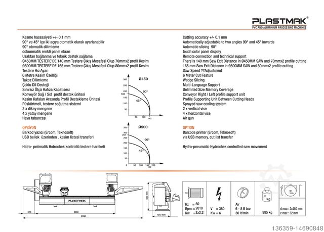 - Пила Ø450 мм имеет расстояние выхода пилы 14 см и возможность резки профиля 70 мм x 2