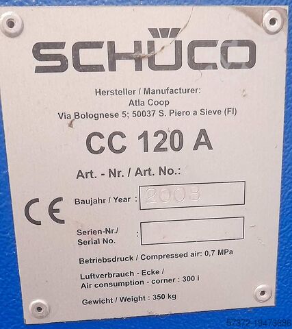 Доступны две углосоединительные машины Schüco для производства окон. 1) Schüco CC 120 A, год выпуска: 2008, макс. высота профиля: 120 мм, макс. высота штамповки: 105 мм, мин. внутренние размеры рамы X/Y: 400 мм/400 мм, габариты машины X/Y/Z: ок. 1450 мм/1500 мм/1000 мм, вес: ок. 700 кг. 2) Углосоединительная машина Schüco, год выпуска: 1997, номинальное давление: 0,7 МПа, расход воздуха: 100 л/угол, вес: ок. 650 кг. Возможен осмотр на месте.