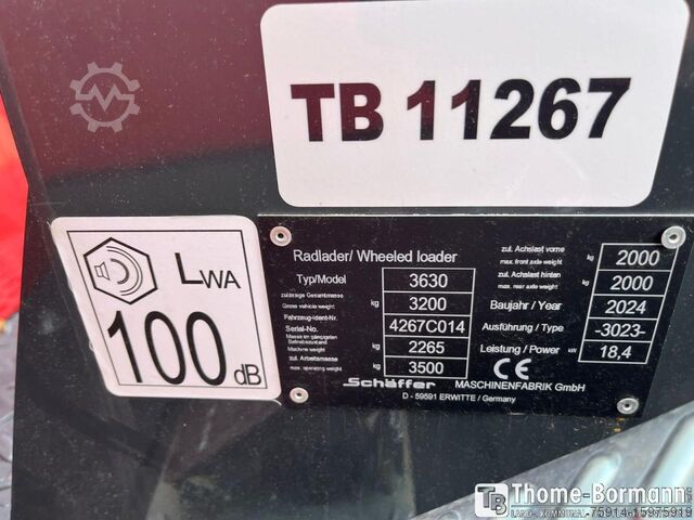 Operating hours: 163_____Schäffer loader type 3630 with ROPS overhead guard Kubota diesel engine D1703M-DI 18 KW = 25 HP Rear weight end plate, hydraulic tool locking, restraint system, hydraulic overdrive 20 km/h with operating manual *Operating hours: approx. 165h*Special equipment Case weight 95 kg Lighting system TÜV certificate self-propelled machine < 25 km/h (lighting system required according to StVZO) Work light set LED 800 lumen (2x front and 1 x rear) Towing device with bolts and lashing eyes Standard tires 10.0/75-15.3 AS ET -40 Mounting frame Euro-WS hydraulic locking Storage location: 54595 Prüm