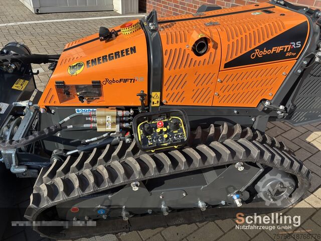 Radio-controlled implement carrier. The Energreen RoboFifti RS is a radio-controlled implement carrier that can be used even in particularly difficult and hard-to-access terrain with gradients of up to 55°. It is equipped with a powerful 50 hp Perkins diesel engine and two hydraulic quick-coupling ports to allow for the attachment of various attachments. - 150m range of the radio remote control - Optimal maneuverability - Ground grip in all directions up to 55° - Special oil pan for safe engine lubrication - Multifunctional use - High performance, fast work completion - Best traction on any surface Special equipment: - Hydraulic quick couplings "CEJN" - EU DUAL BAND radio remote control with tilt sensor - Bio-hydraulic oil PANOLIN HLP SYNTH 46 - Standard color: Orange RAL 2011 / Gray RAL 7021 - Rear radiator guard - Counterweights Comp. 70 kg - 1 LED work light - LED all-round warning light 12 Volt with bayonet lock We have a grass mulcher, forestry mulcher, brush cutter head, and a stump grinder in stock. Additional attachments such as double cutter bars, mowing booms, and many other attachments are available upon request! We are happy to offer suitable financing, hire purchase, or leasing. Delivery or shipping by arrangement. We We always have a selection of used and new equipment in stock, as well as other equipment for demonstration. Contact us! We also rent all equipment with and without a driver. Other information: - Trade-ins and purchase of vehicles and machines are possible. - Sales price excludes transport. - No liability for printing and typographical errors. - Errors, changes, and prior sale reserved. - Offer subject to change. - Photos may vary. Price is based on current condition. - All information is subject to change.