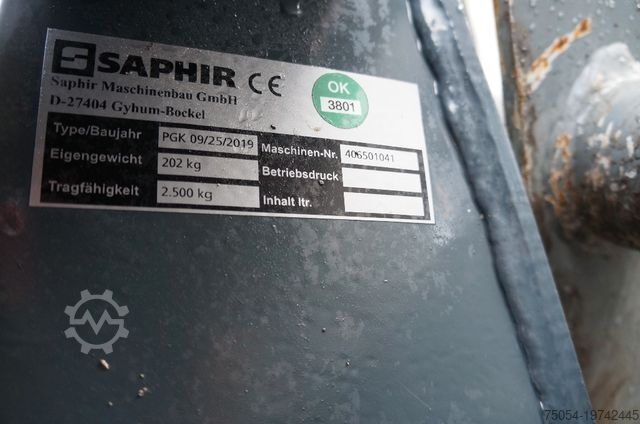 Stock clearance of a pallet fork with hydraulic log clamp. Suitable for Euro mount on the front loader or three-point hitch at the rear or front attachment area. The base plate is universally usable. Two bale spikes are also included in the package and are perfect for hay and straw harvesting.