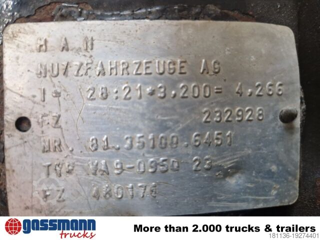 Vehicle location: Bovenden, Axle number: 81.35100.6451! 9t front axle! Drum brakes! Leaf sprung! Dismantled from MAN 4x4! Gear ratio: 28:21x3.200=4.266 Springs available at a net surcharge of €450.00 for both together! ACCESSORY INFORMATION WITHOUT GUARANTEE, subject to changes, interim sale, and errors!