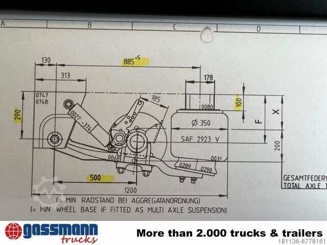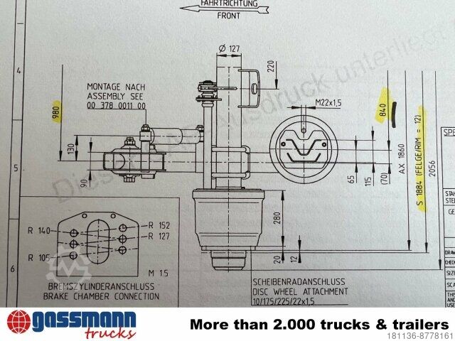 Body: 9t trailer axle 9t SAF axle, drum brakes, including air suspension bellows, track approx. 1884mm, wall thickness 127x20, with ABS sensors, brake SNK 300x200.