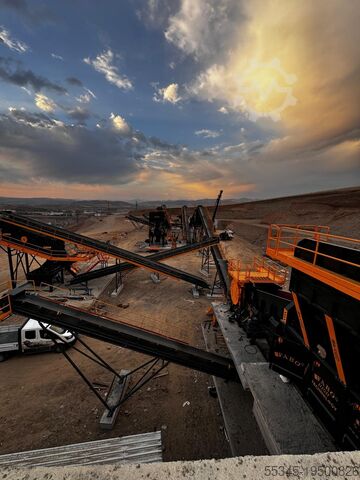 Стационарная дробильно-сортировочная установка производительностью 200-350 тонн в час состоит из бункера с вибрационным питателем объемом 30 м³, промежуточного грохота, щековой дробилки CLK-110, конусной дробилки, роторной дробилки с вертикальным валом, конвейеров подачи и возврата, кабины управления и системы автоматизации. Продукты, поступающие в загрузочный бункер, отделяются от грязи и шлама с помощью промежуточного грохота и обводятся обводным конвейером. Материал над грохотом поступает в щековую дробилку, продукты на втором уровне попадают на щековый разгрузочный конвейер, а продукты на самом нижнем уровне отбрасываются в качестве байпаса. Щековая дробилка имеет максимальную загрузочную способность 800 мм и измельчает продукты, которые сначала попадают на промывочный грохот. Здесь самые мелкие продукты отправляются на склад с помощью шнековой шайбы, а остальные продукты направляются в конусную дробилку. Продукты, выходящие из конусной дробилки, направляются на другой грохот и в роторную дробилку с вертикальным валом, что позволяет получить на конечном грохоте желаемые продукты высокого качества.