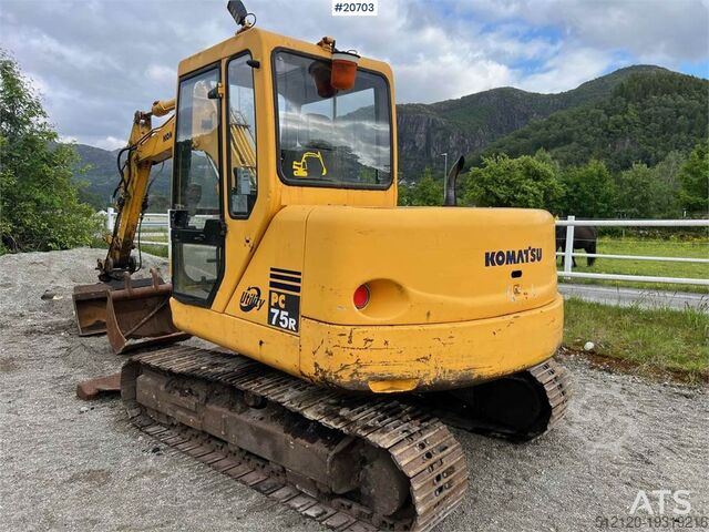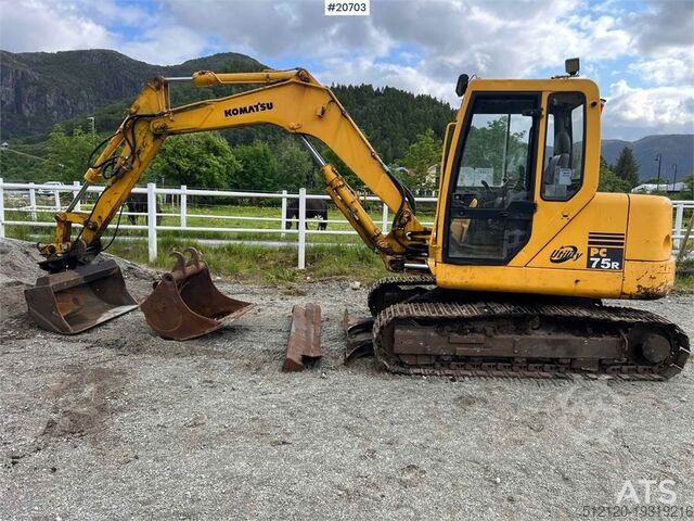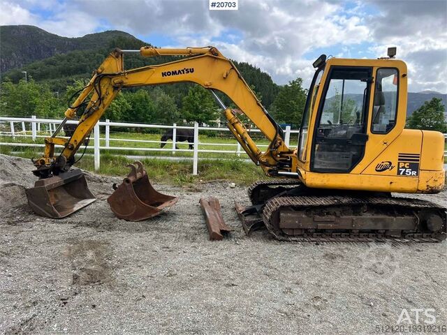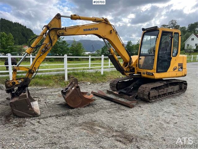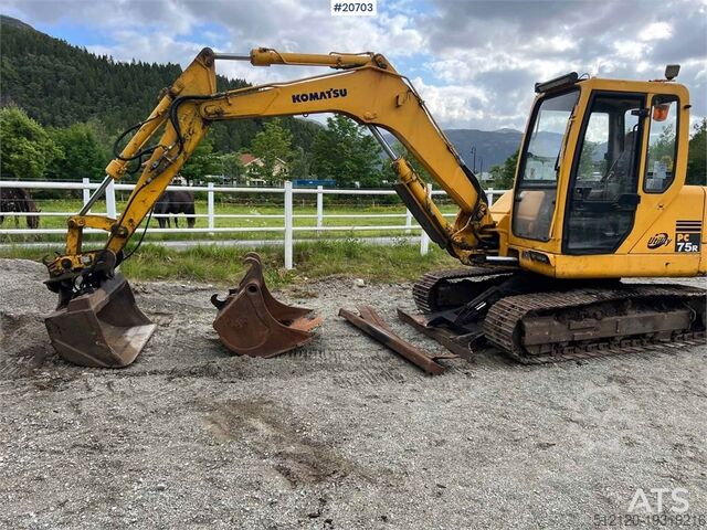 В продаже экскаватор Komatsu PC75 1997 года выпуска, оснащённый гидравлическим ковшом для песка, планировочным и зачистным ковшами.